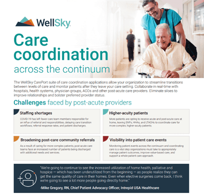 The WellSky® CarePort Connect solution enhances patient care coordination across acute, post-acute, and community care settings. Through this solution, healthcare providers and agencies can access a broader network of patient data and gain real-time insights to support their care teams. CarePort Connect helps reduce rehospitalizations, streamline collaboration, and improve patient outcomes.